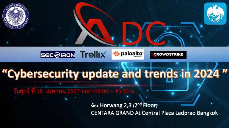 บริษัท แอดวานซ์ ดิจิตอล คอนซัลแทนท์ กรุ๊ป จำกัด โดย คุณสุภัสสรา ในนามเจ้าของบริษัท ขอขอบพระคุณ รองปลัดกระทรวงการคลัง(MCIO) ท่านอัครุตม์ สนธยานนท์ ที่ให้เกียรติมาเป็นประธานเปิดพิธีจนถึงปิดพิธีงาน และที่ปรึกษาด้านเทคโนโลยีสารสนเทศและการสื่อสาร ประจำกระทรวงการคลัง ท่านดร.เฉลิมศักดิ์ เลิศวงศ์เสถียร พร้อมด้วย ผู้อำนวยการศูนย์และผู้อำนวยการส่วนทุกท่าน ศูนย์เทคโนโลยีสารสนเทศกระทรวงการคลังและ ผู้อำนวยการและผู้จัดการอาวุโสทุกท่าน กรุงไทยคอมพิวเตอร์เซอร์วิส ร่วมกับพาร์ทเนอร์ Paloalto Networks, Trellix, Crowdstrike, Sec Iron ของบ. ADC group